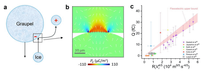 연구팀은 구름 속에서 일어나는 얼음 알갱이 충돌을 모델링해, 플렉소 일렉트릭 효과에 의해 발생하는 전하량을 계산했더니, 충돌 시 얼음 알갱이가 크게 변형되어 큰 전위차를 발생시키는 것으로 나타났다.